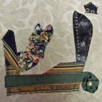 Chaya Erez’s “Dice Drawing” based on throwing dice on the paper hoping to hit the centre producing a random piece. Chaya decides the rules, but the final product comes by chance. Her numbered grid of 6 rows by 6 with pulled out fabric, random shapes, random sizes and placement produced a finished product. You can only see this at the Pomegranate Guild where talent and creativity meet.