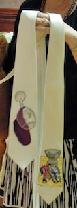 Dorothy Klein showed two challah covers. One cover had her wedding photo transferred onto fabric and applied to the fabric; one cover featured the days of creation.
