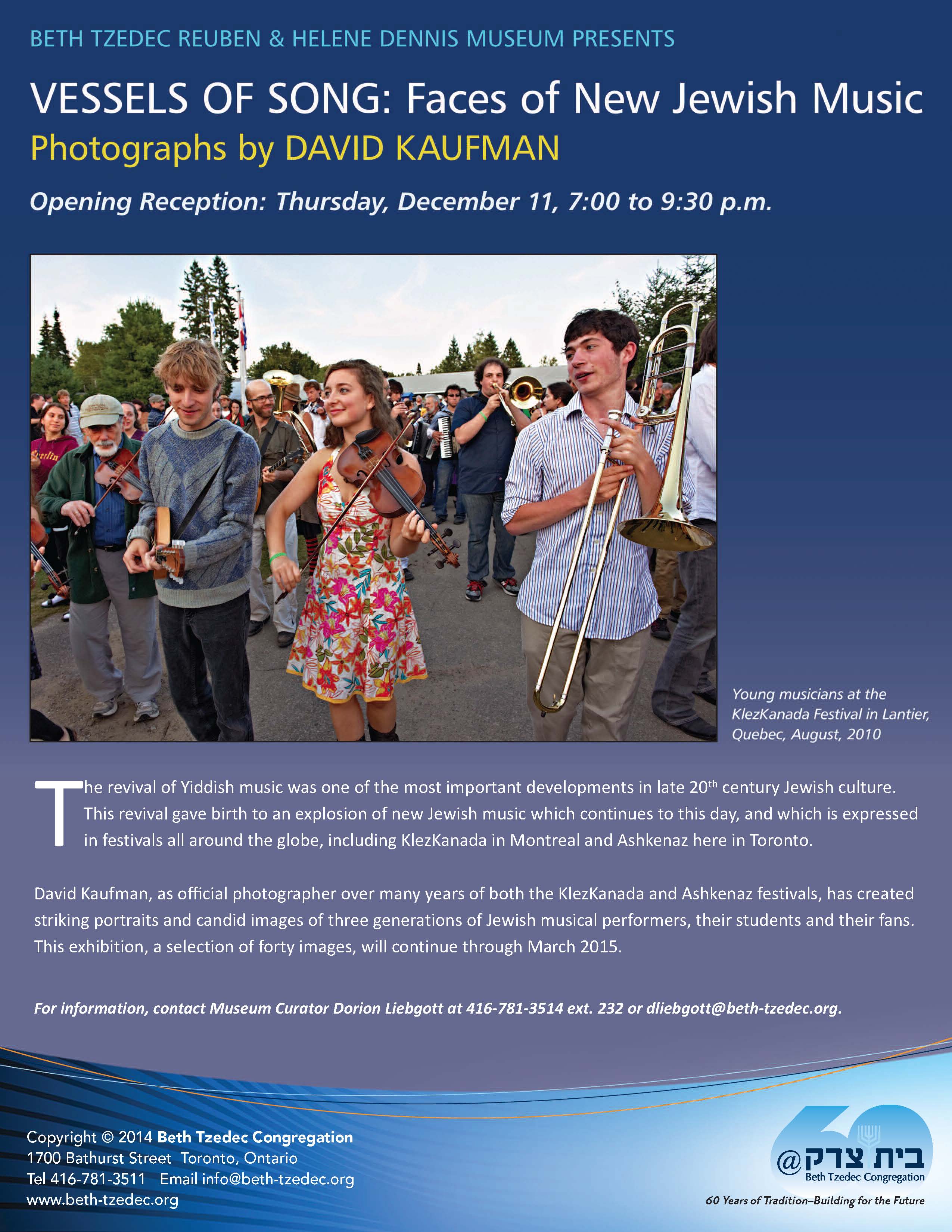 Dorion invites us: “Please join us for the opening of David Kaufman’s photography exhibition: VESSELS OF SONG: FACES OF NEW JEWISH MUSIC at Beth Tzedec Museum
