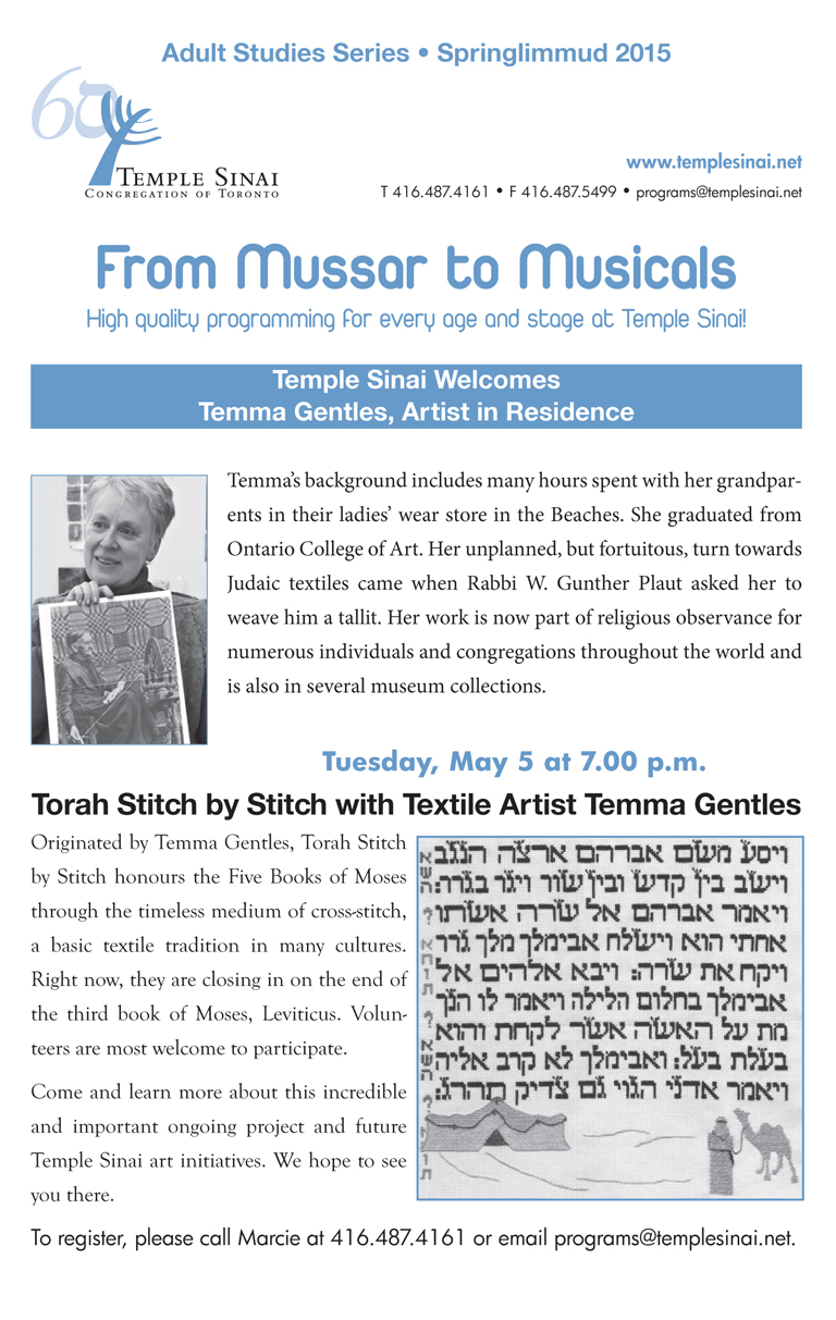 Torah – stitch by stitch by stitch Posted on May 1, 2015 by pomegranateguild18 Pomegranate Guild member Temma Gentles will be providing an update of the Torah Stitch by Stitch project at a public presentation at Temple Sinai on Tuesday May 5, 2015. See the flyer for details. Share this: Click to email a link to a friend (Opens in new window) Email Click to share on LinkedIn (Opens in new window) LinkedIn Click to share on Pinterest (Opens in new window) Pinterest Click to share on X (Opens in new window) X Click to share on Facebook (Opens in new window) Facebook Like Loading... Related